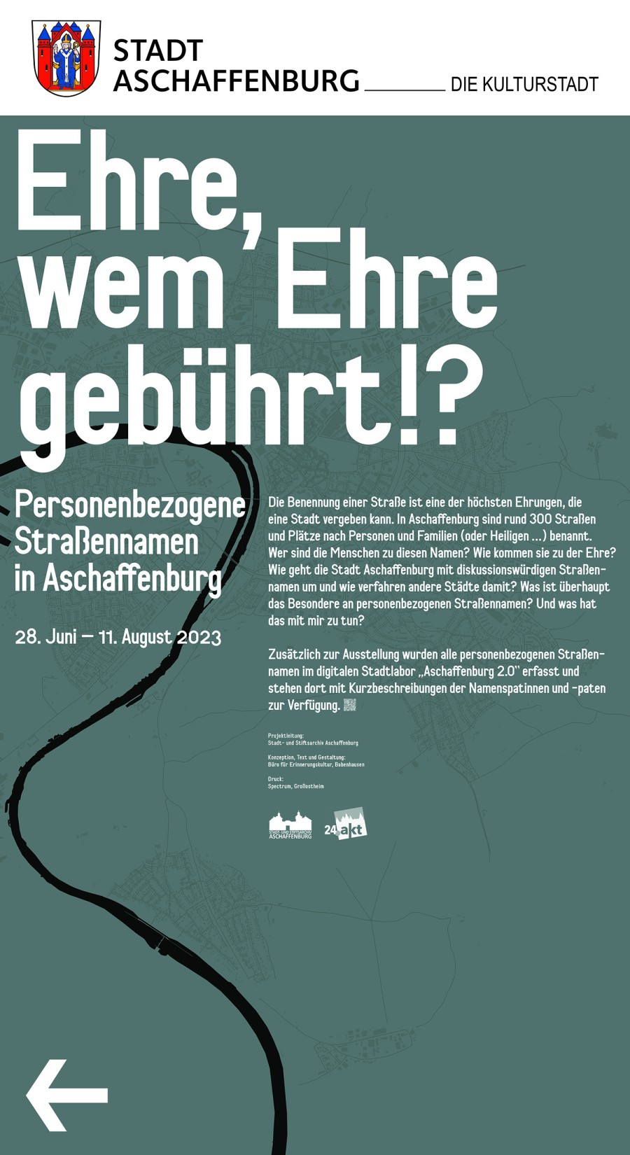 Ausstellung „Ehre, wem Ehre gebührt!? - Personenbezogene Straßennamen in Aschaffenburg“ im Schönborner Hof Aschaffenburg, 28. Juni – 11. August 2023.