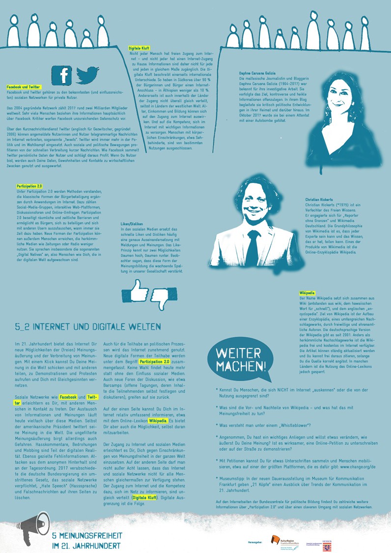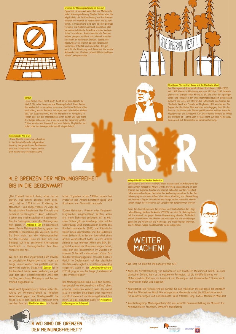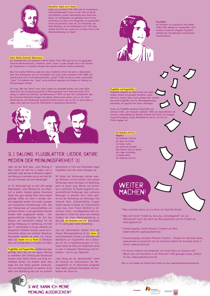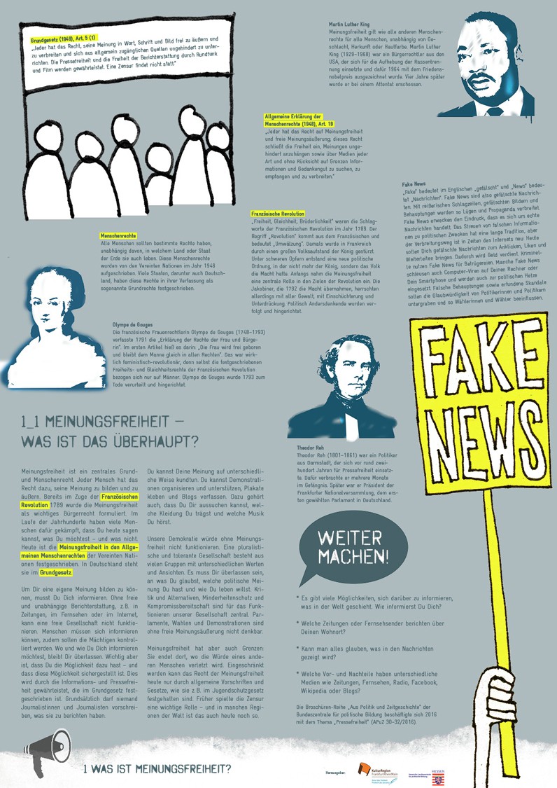 Sammelmappe „Meinungsfreiheit gestern und heute. Einführung, Material und Impulse für die Gruppenarbeit (ab 14 Jahren) mit Beispielen aus Hessen und der Rhein-Main-Region“. Einführung in Geschichte und Gegenwart der Meinungsfreiheit. Materialsammlung (DIN A4) mit zehn thematisch sortierten Faltplakaten (DIN A2) sowie 24 Rollenkarten mit Kurzporträts, 2017.