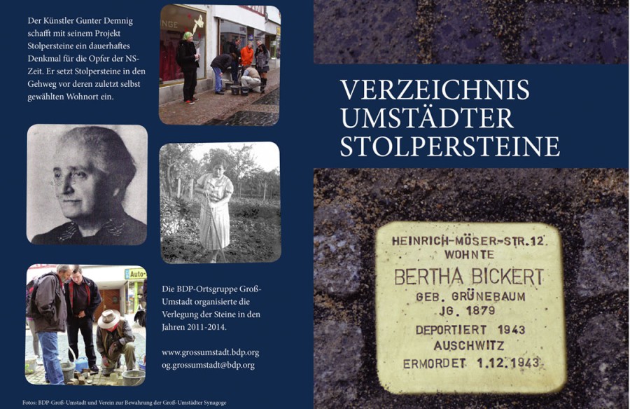 Faltplan "Verzeichnis Umstädter Stolpersteine", inklusive exemplarischer Familienbiografien zu verlegten Stolpersteinen in Groß-Umstadt, 2015.